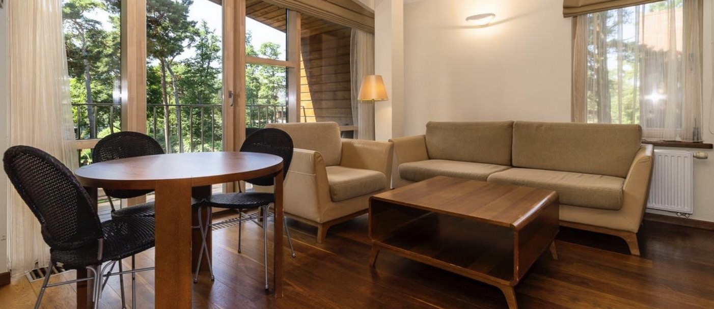 Erdvūs dviejų miegamųjų apartamentai, talpinantys iki 5 asmenų. Su balkonu.